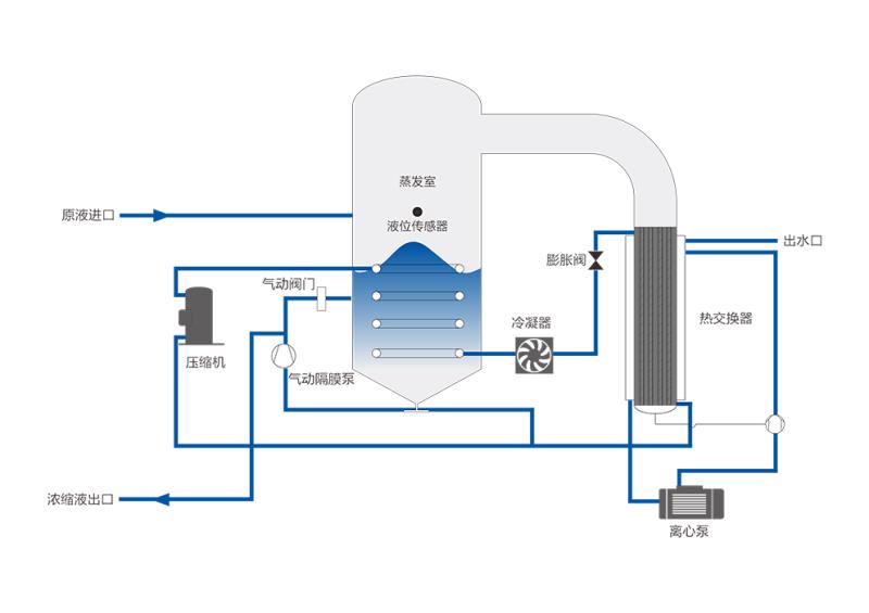 热泵蒸发器采用热泵压缩的原理,在两端输出热媒和冷媒同时对物料进行蒸发和对蒸汽进行冷凝,与此同时高真空度保证物料能在极低的温度下进行蒸发,这就解释了为什么热泵蒸发技术在小型蒸发应用上最为高效节能及环保。